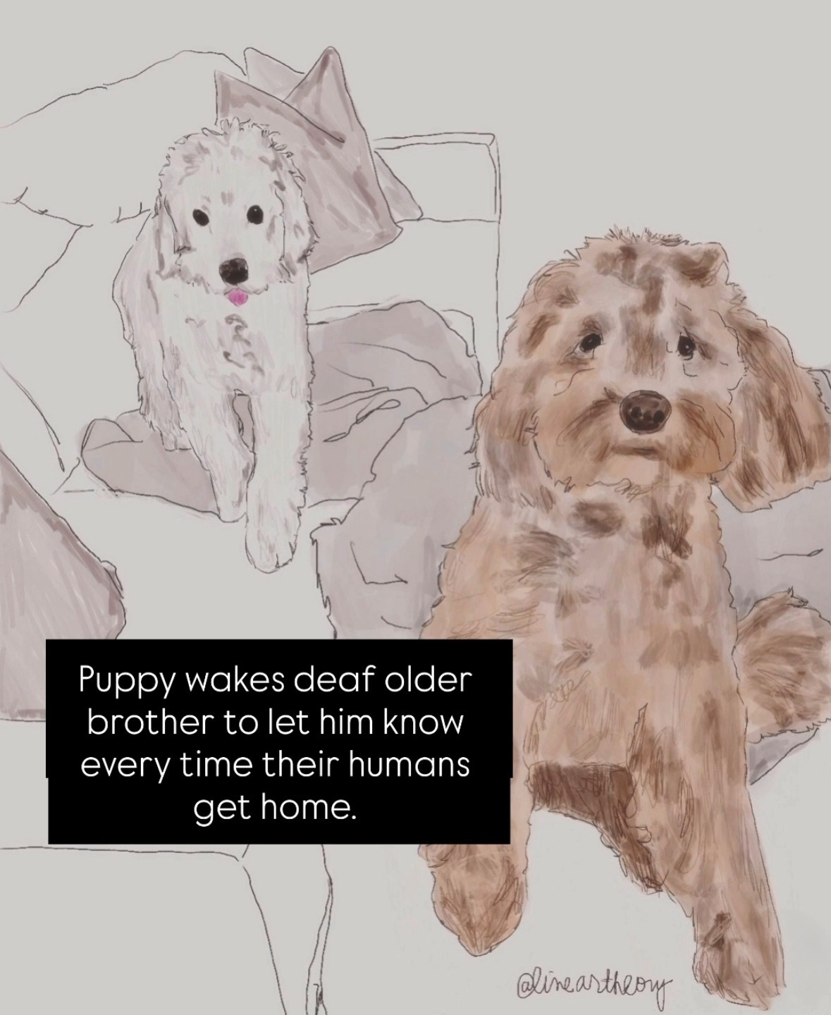 This is Archie. He’s deaf and doesn’t hear when his humans get home. Luckily, his little brother Frankie lets him know with a gentle nudge to make sure he doesn’t miss the moment. (Video and poem below illustration).